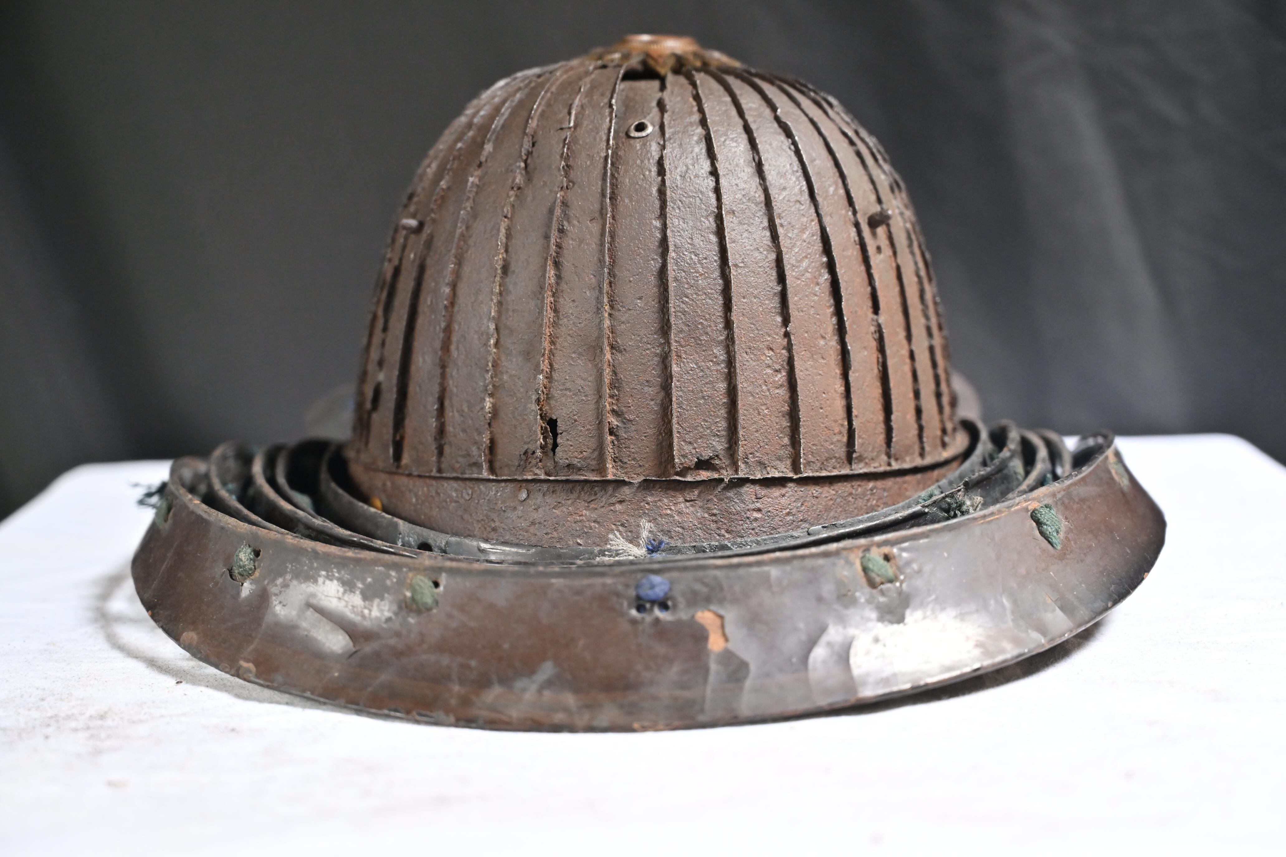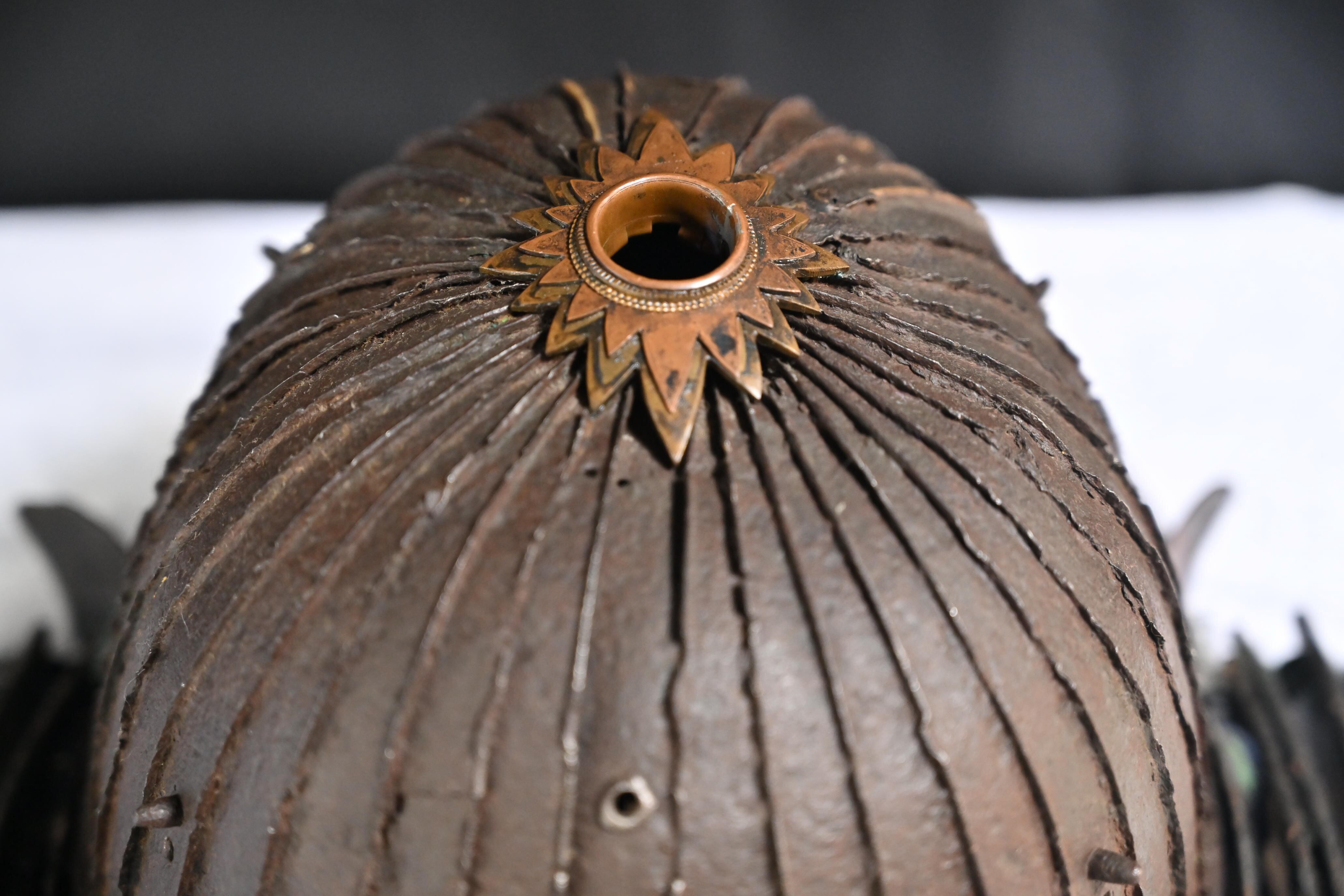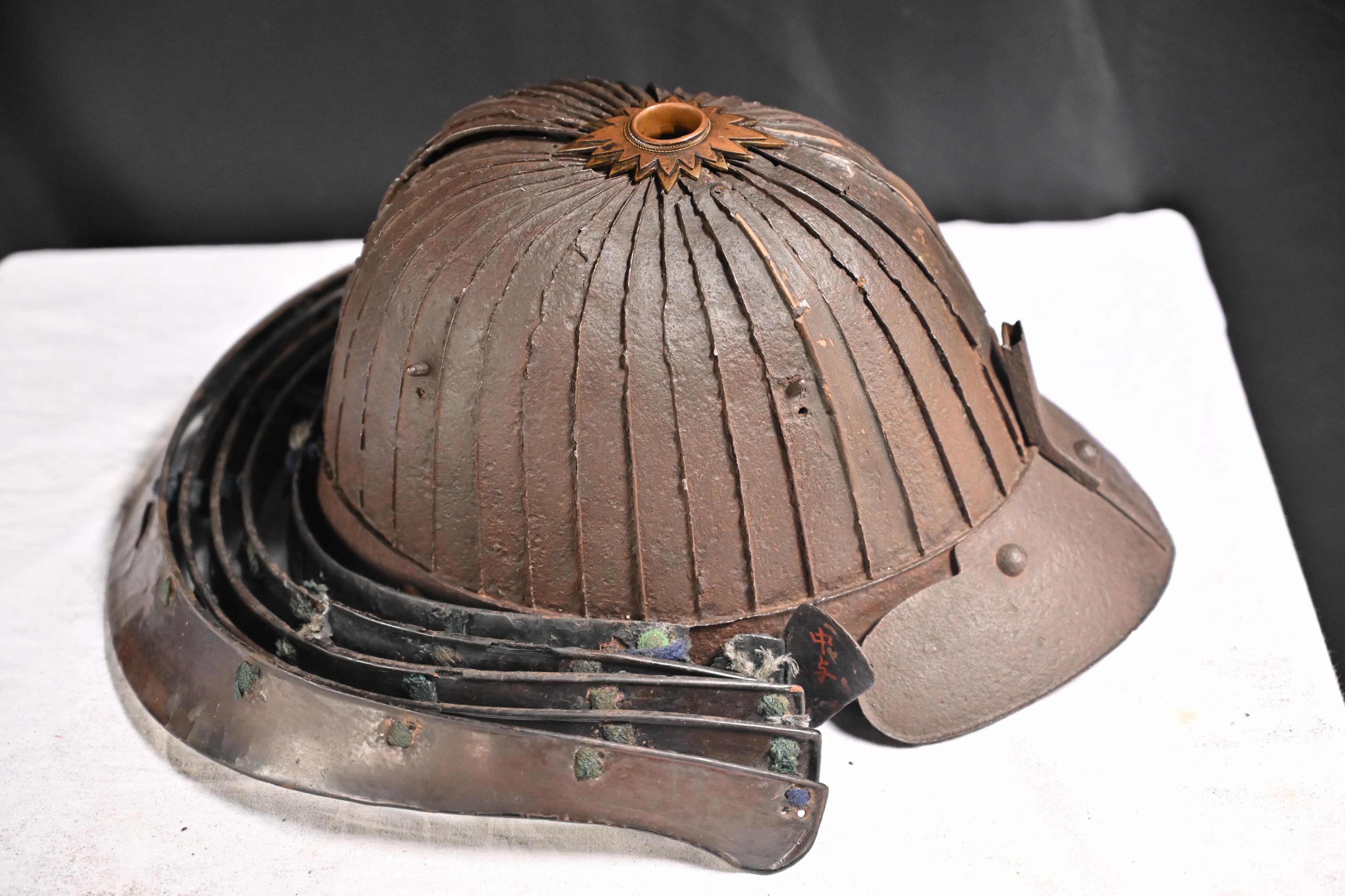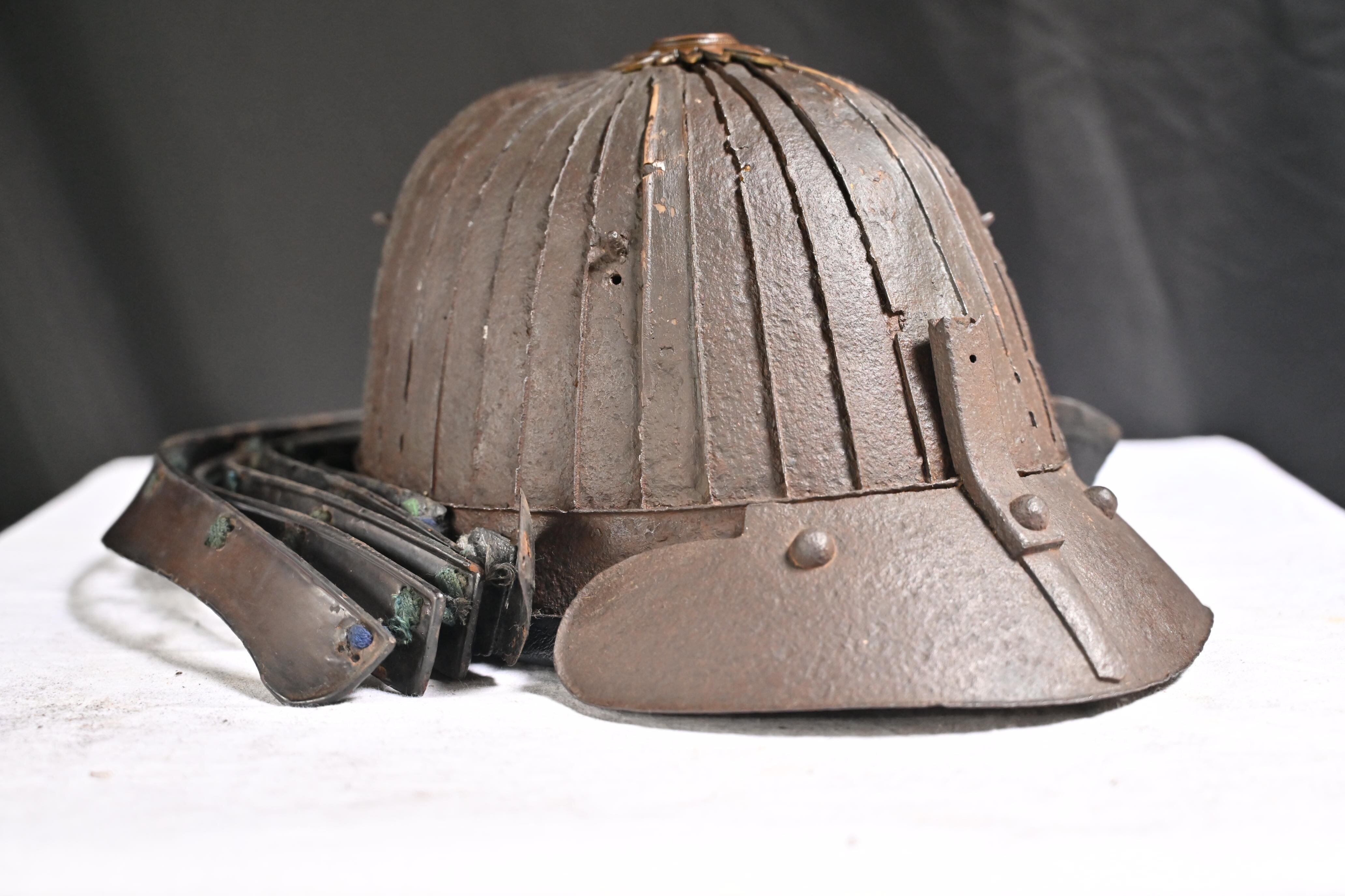 異風の八幡座が据えられた鉄製筋兜です。前所有者がかぶれるように改修したのでしょうか、受張が新しいものに変わっていますが、兜鉢・錣は江戸時代の品です。