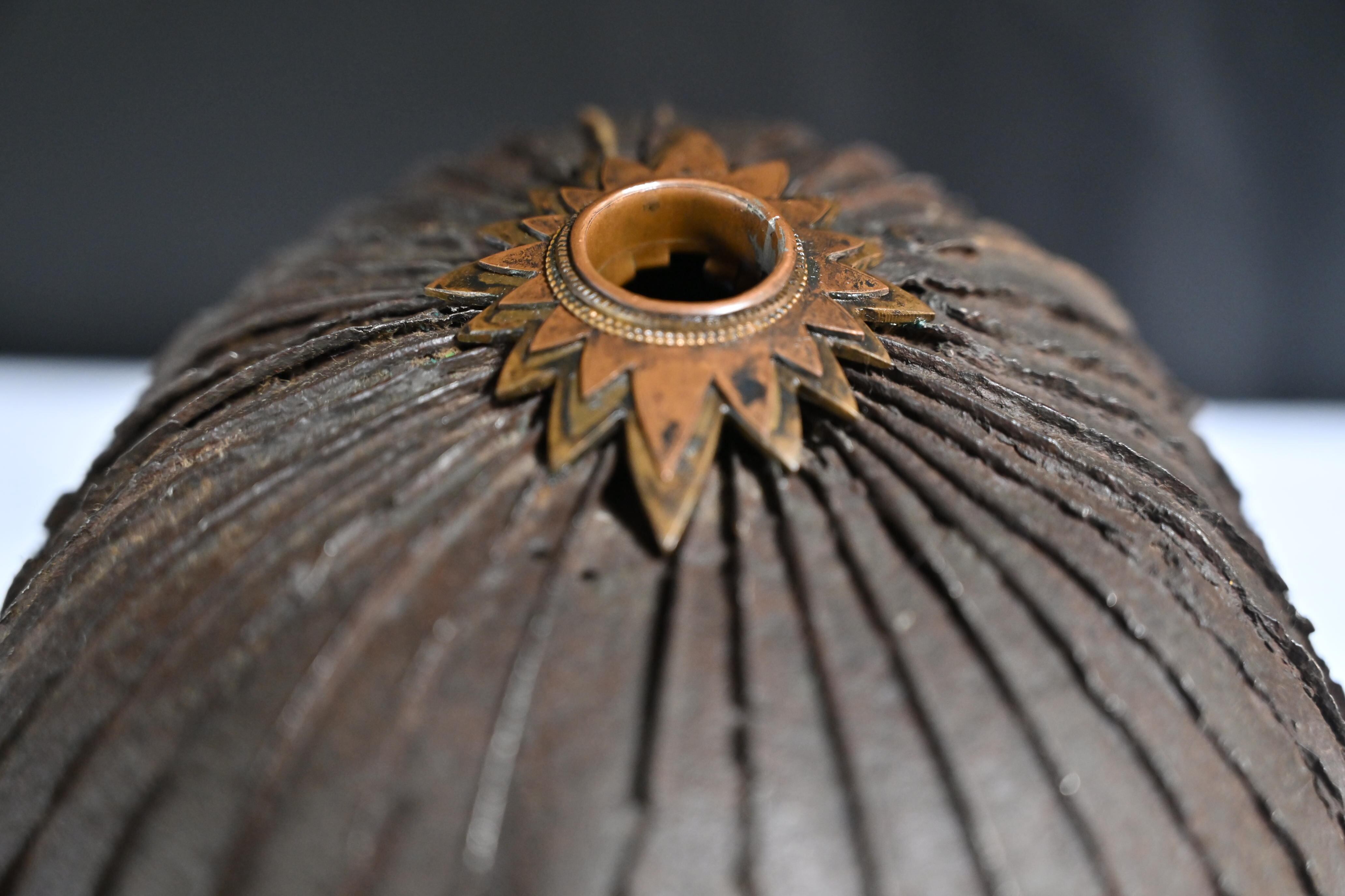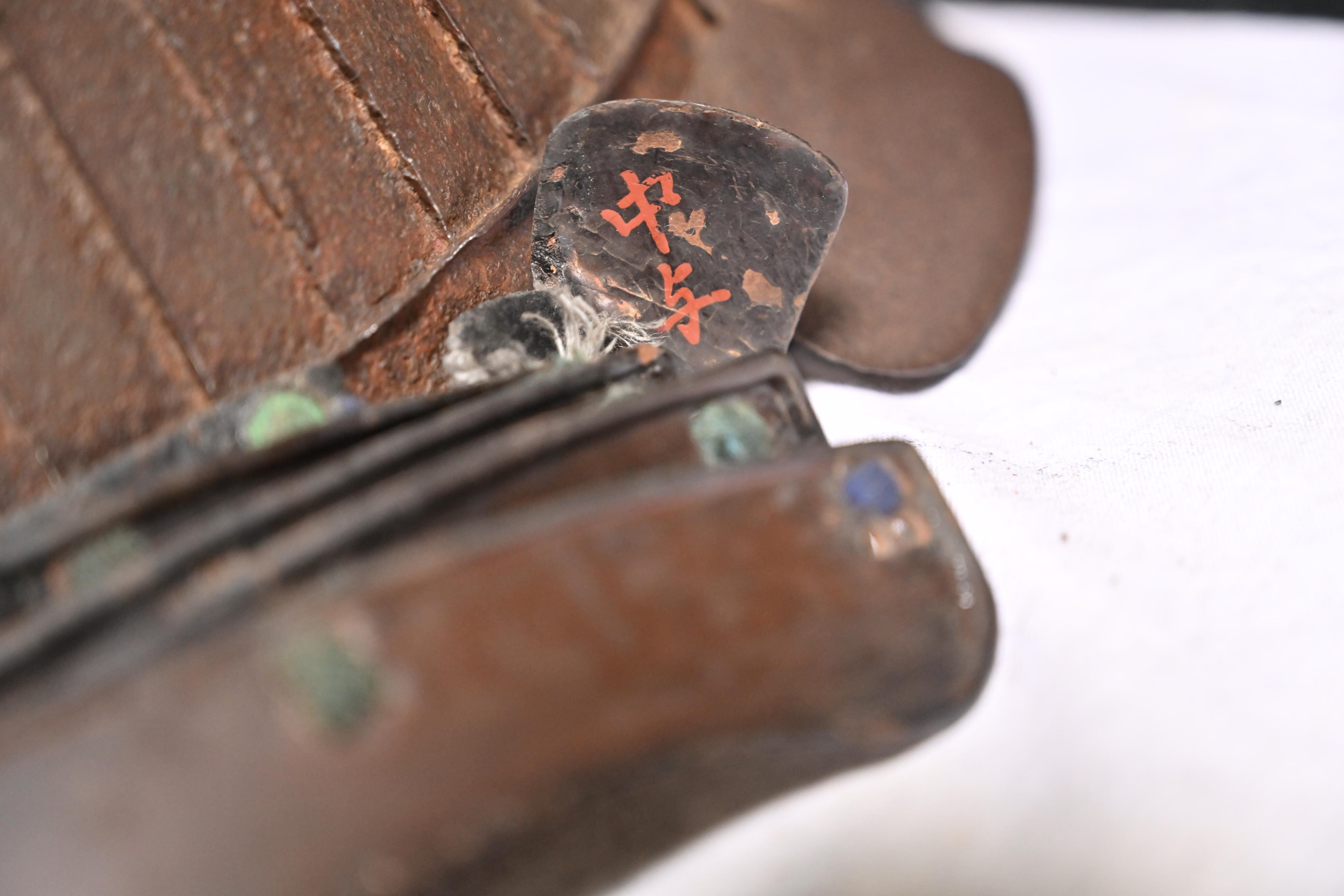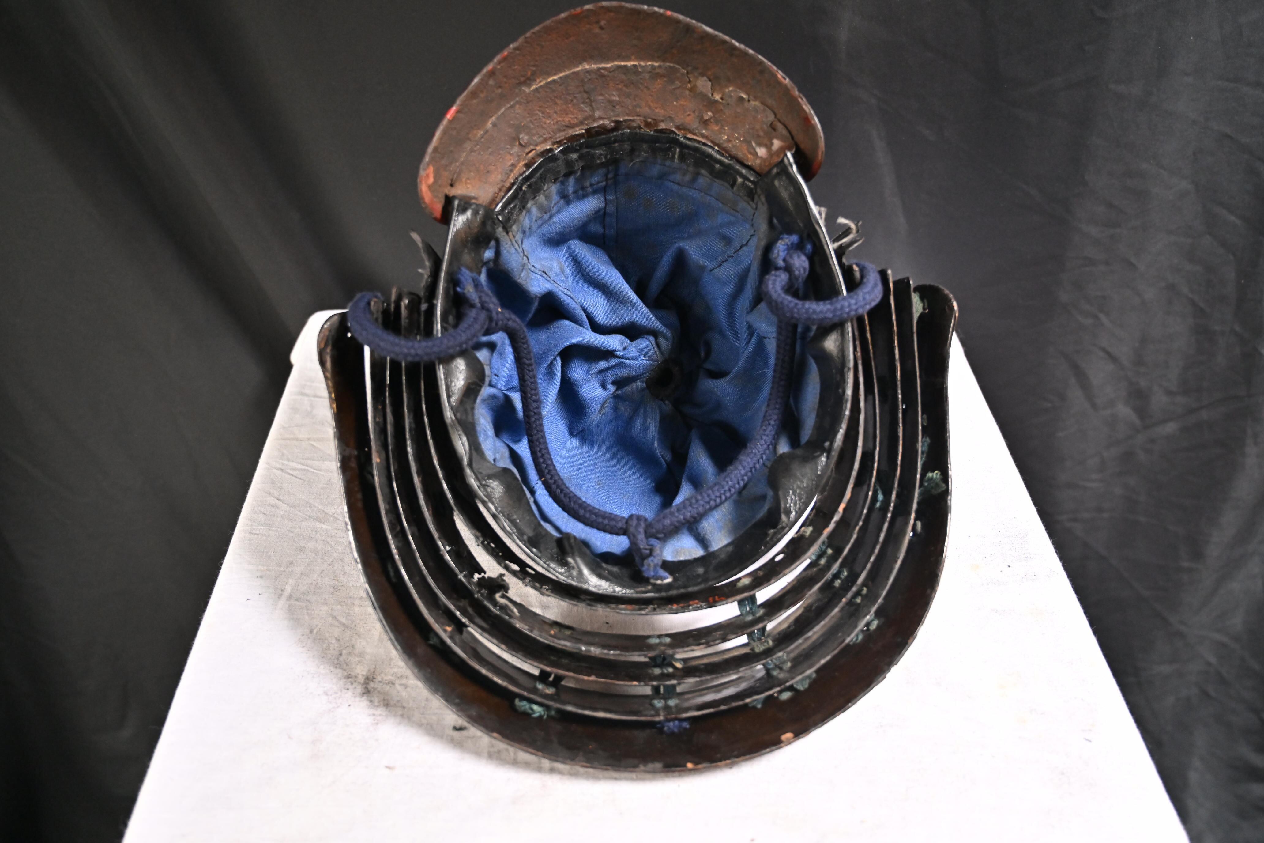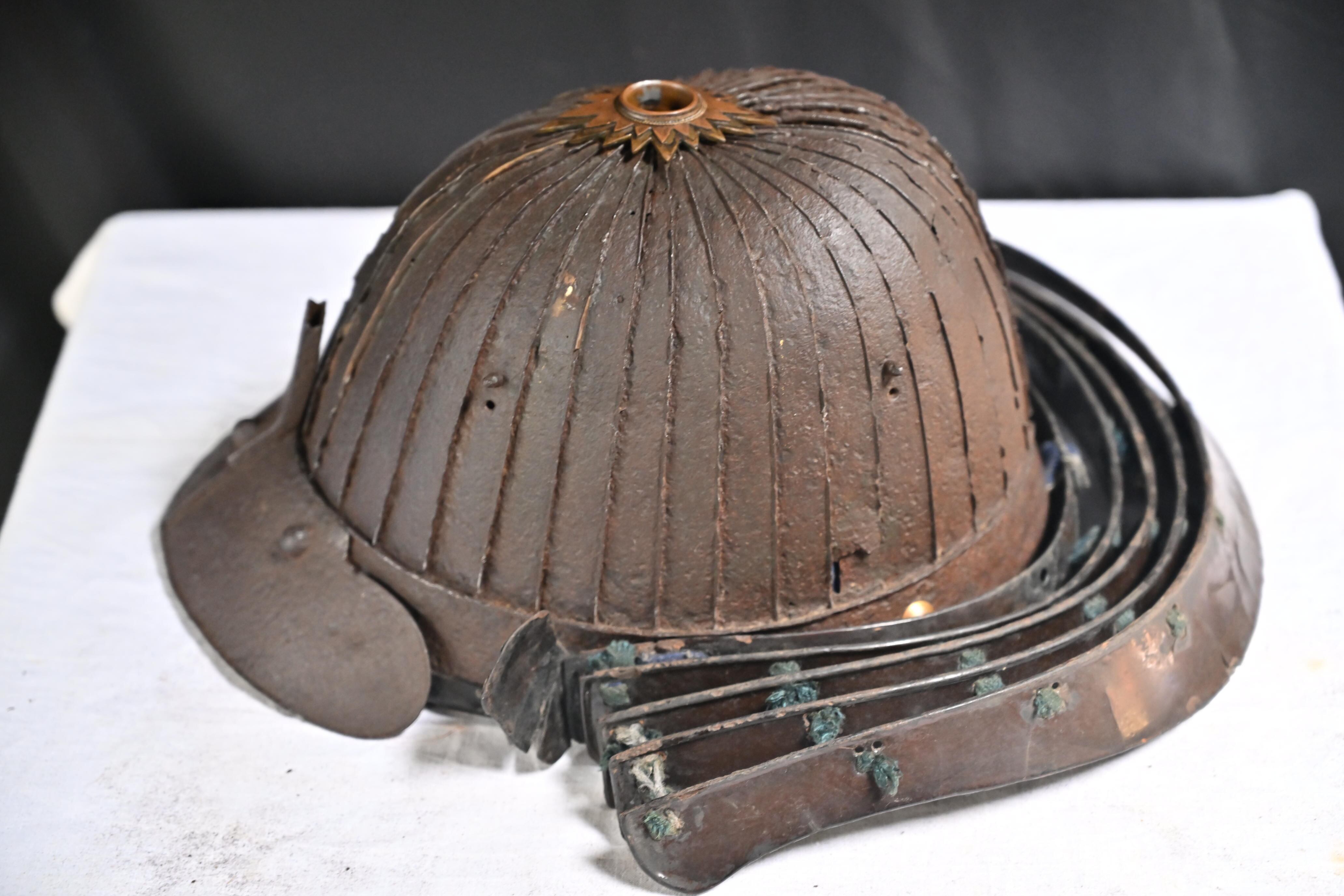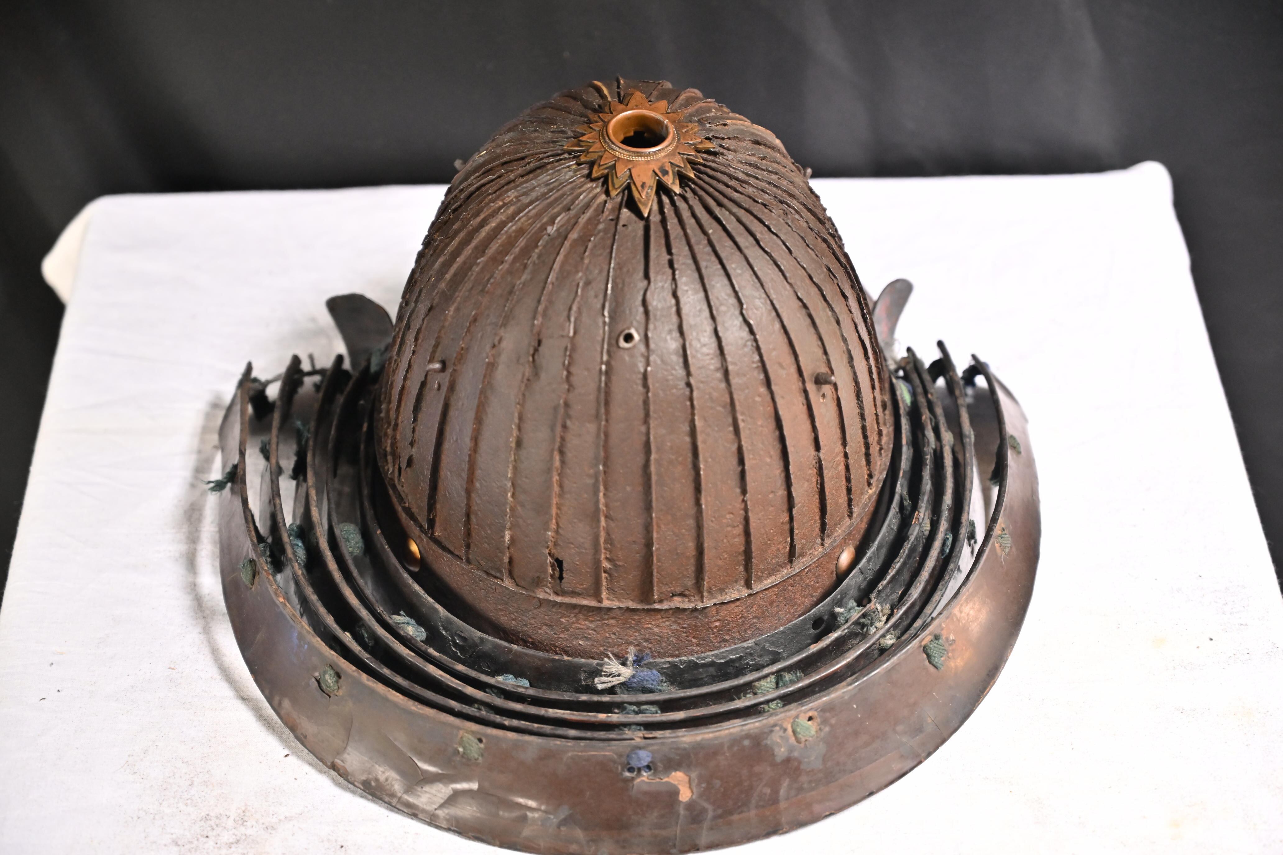 異風の八幡座が据えられた鉄製筋兜です。前所有者がかぶれるように改修したのでしょうか、受張が新しいものに変わっていますが、兜鉢・錣は江戸時代の品です。