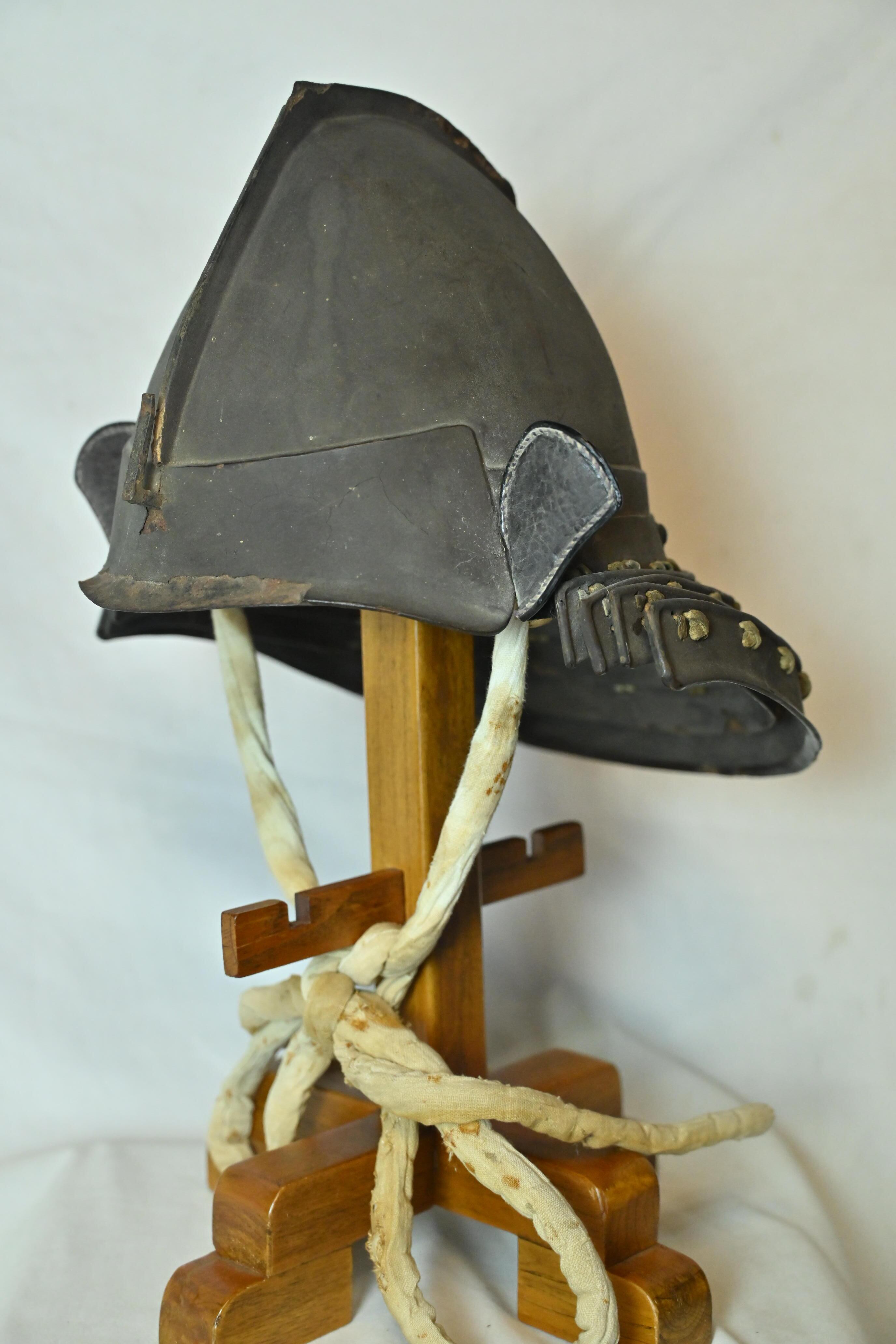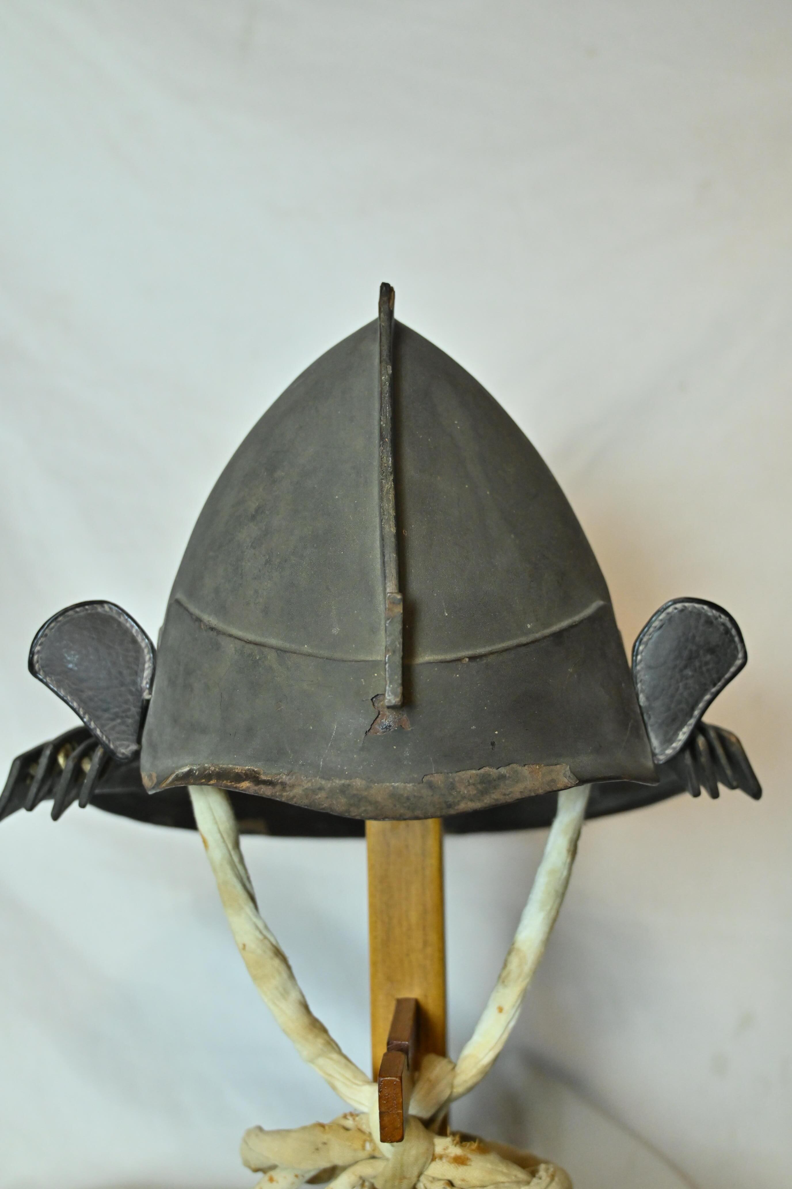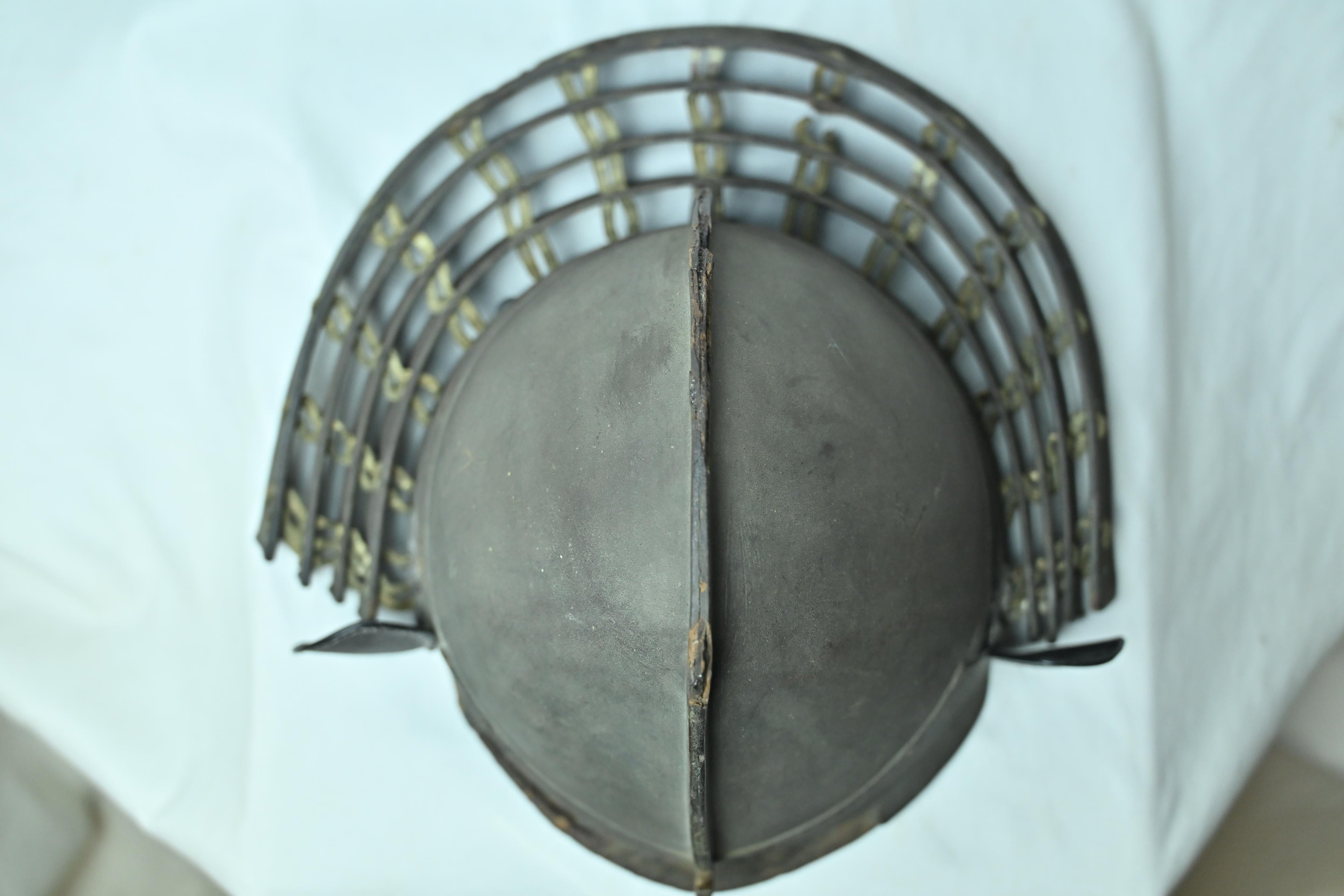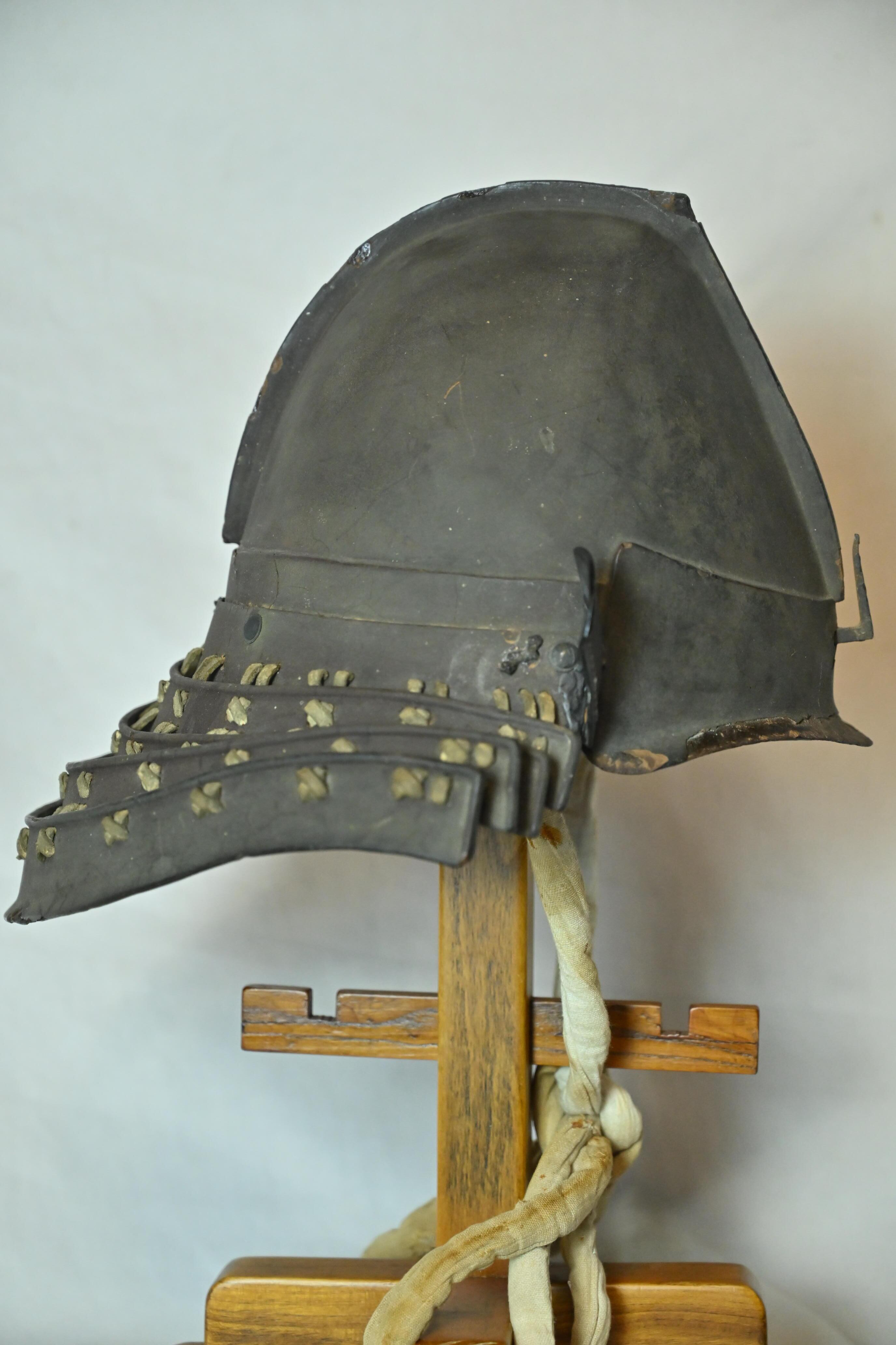 南蛮風の意匠に近い、変わり兜の一つ、鉄製桃形兜です。白韋ですがけに威された錣です。江戸時代です。重量感があります。